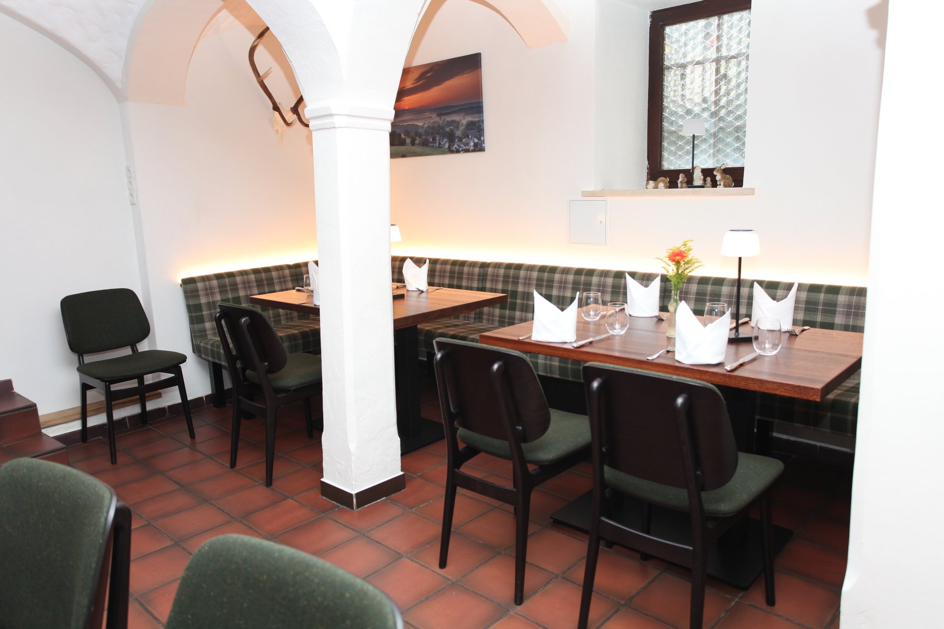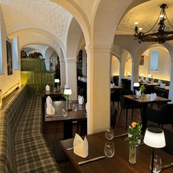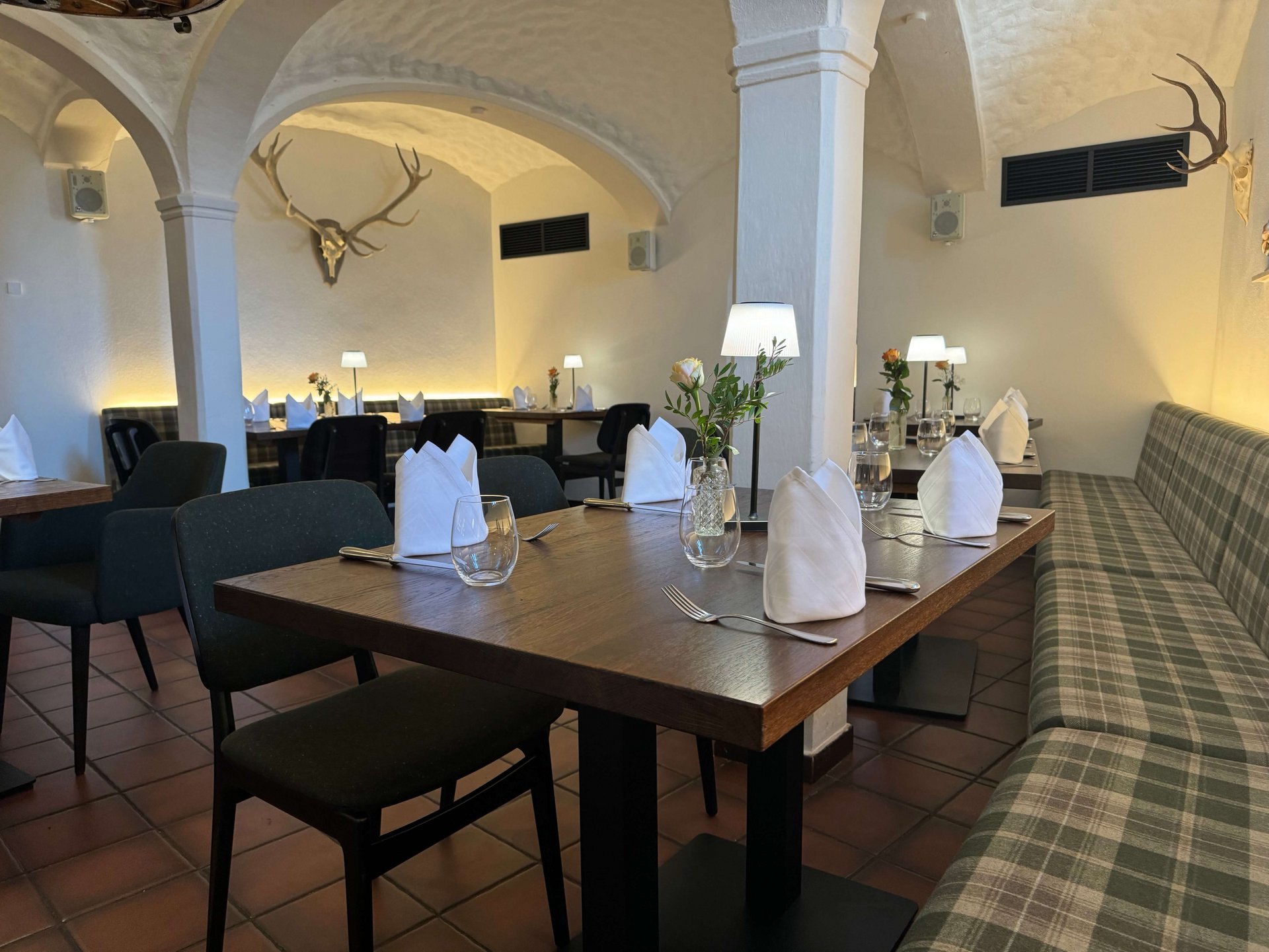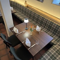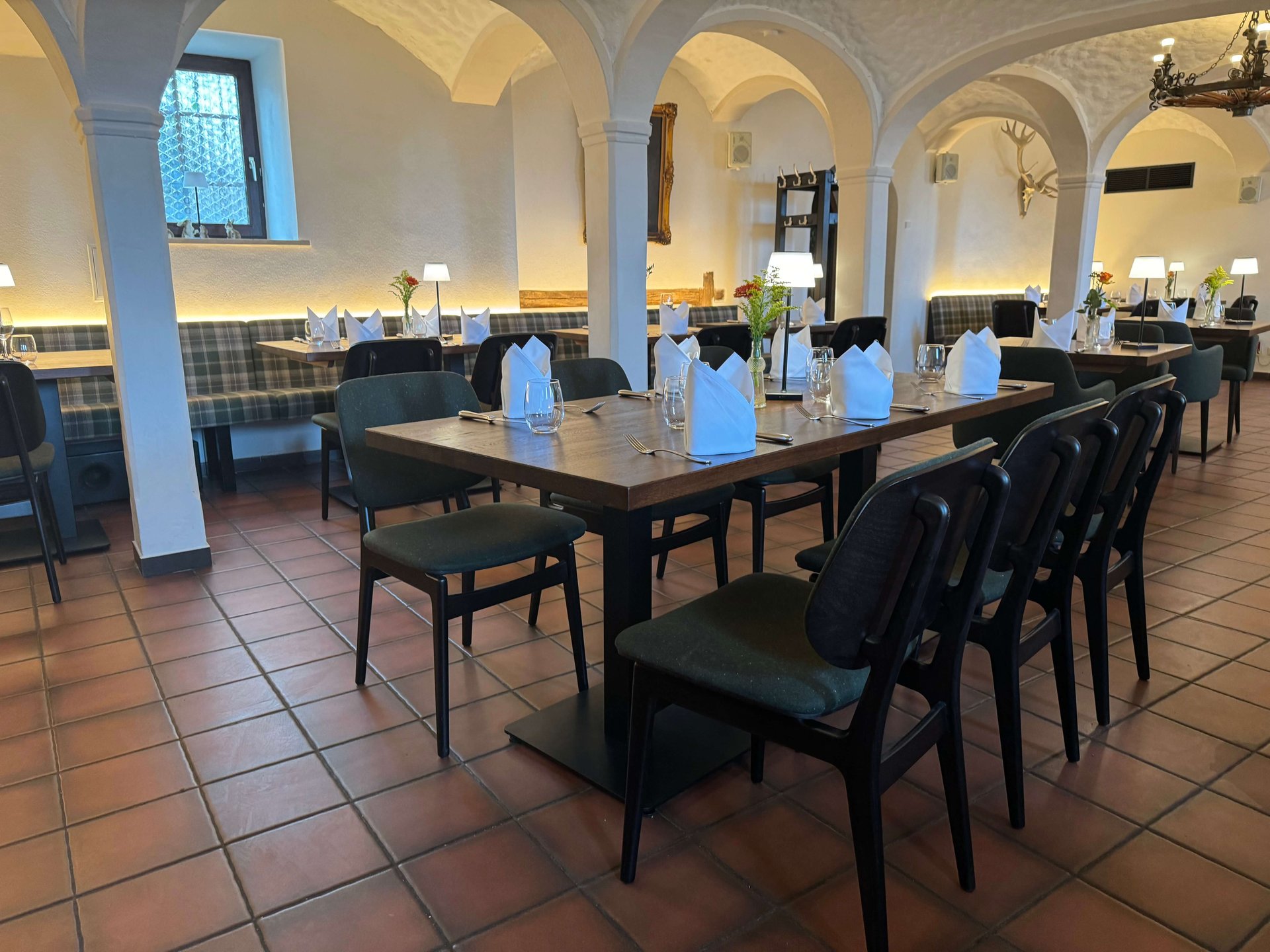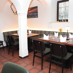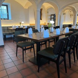 Inmitten des Gewölbekellers des Restaurants Hallermühle im oberfränkischen Lehen trifft Franken auf Moderne. Dazu passend: Optisch edle Holztische und maßgeschneiderte Bänke mit individueller Polsterung als gemütliche Sitzmöglichkeit – ergänzt durch gepolsterte Stühle.