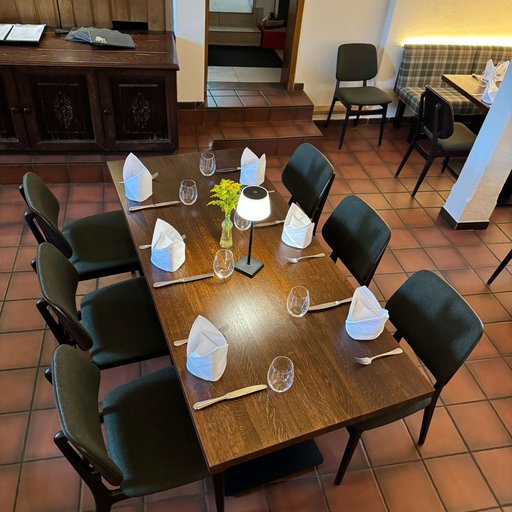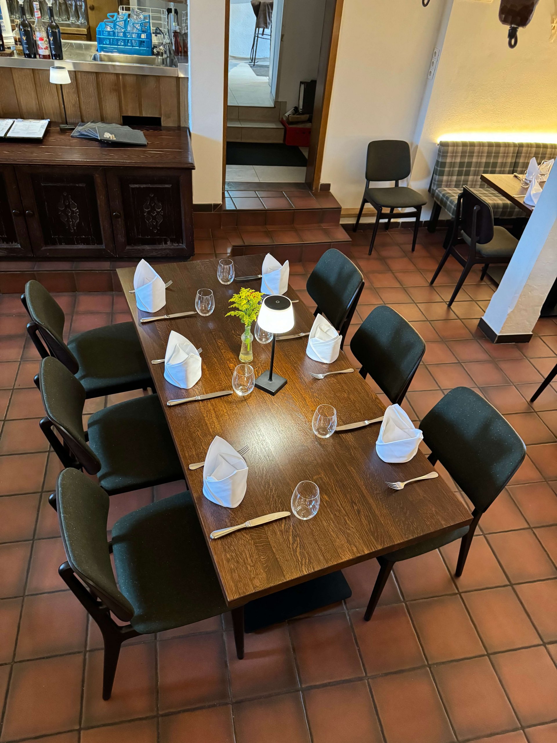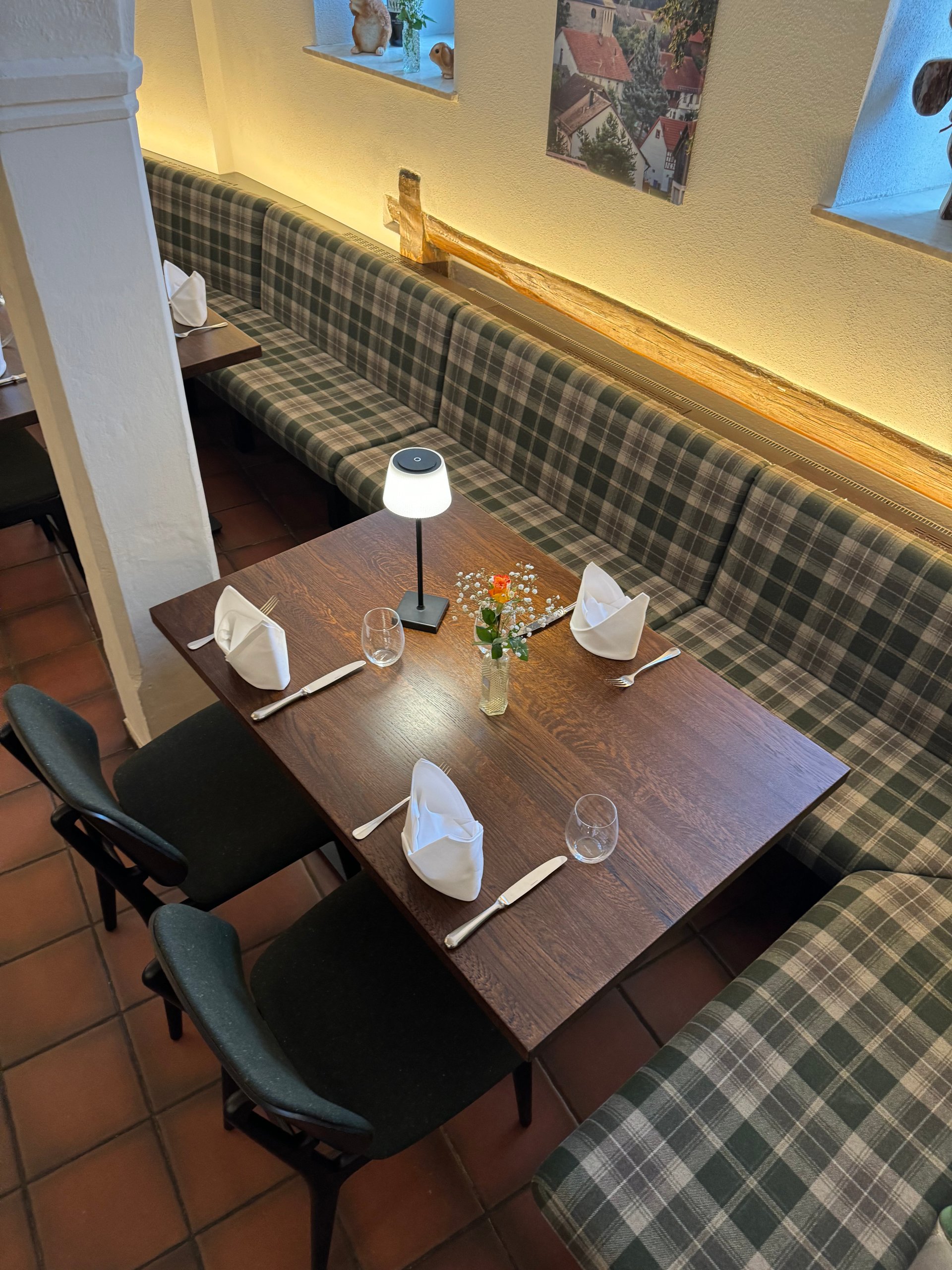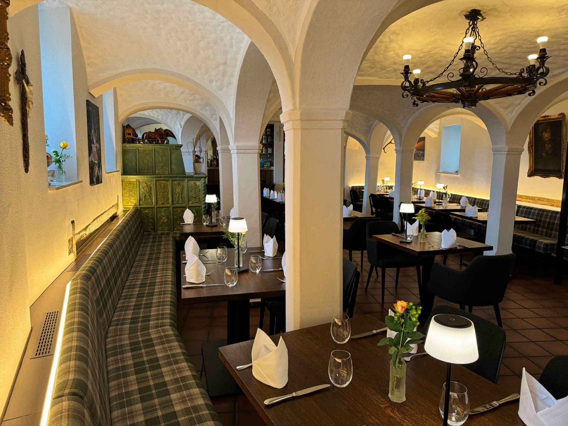 Inmitten des Gewölbekellers des Restaurants Hallermühle im oberfränkischen Lehen trifft Franken auf Moderne. Dazu passend: Optisch edle Holztische und maßgeschneiderte Bänke mit individueller Polsterung als gemütliche Sitzmöglichkeit – ergänzt durch gepolsterte Stühle.