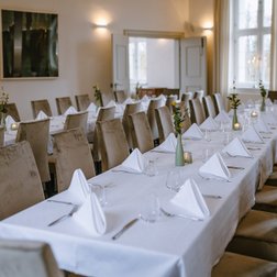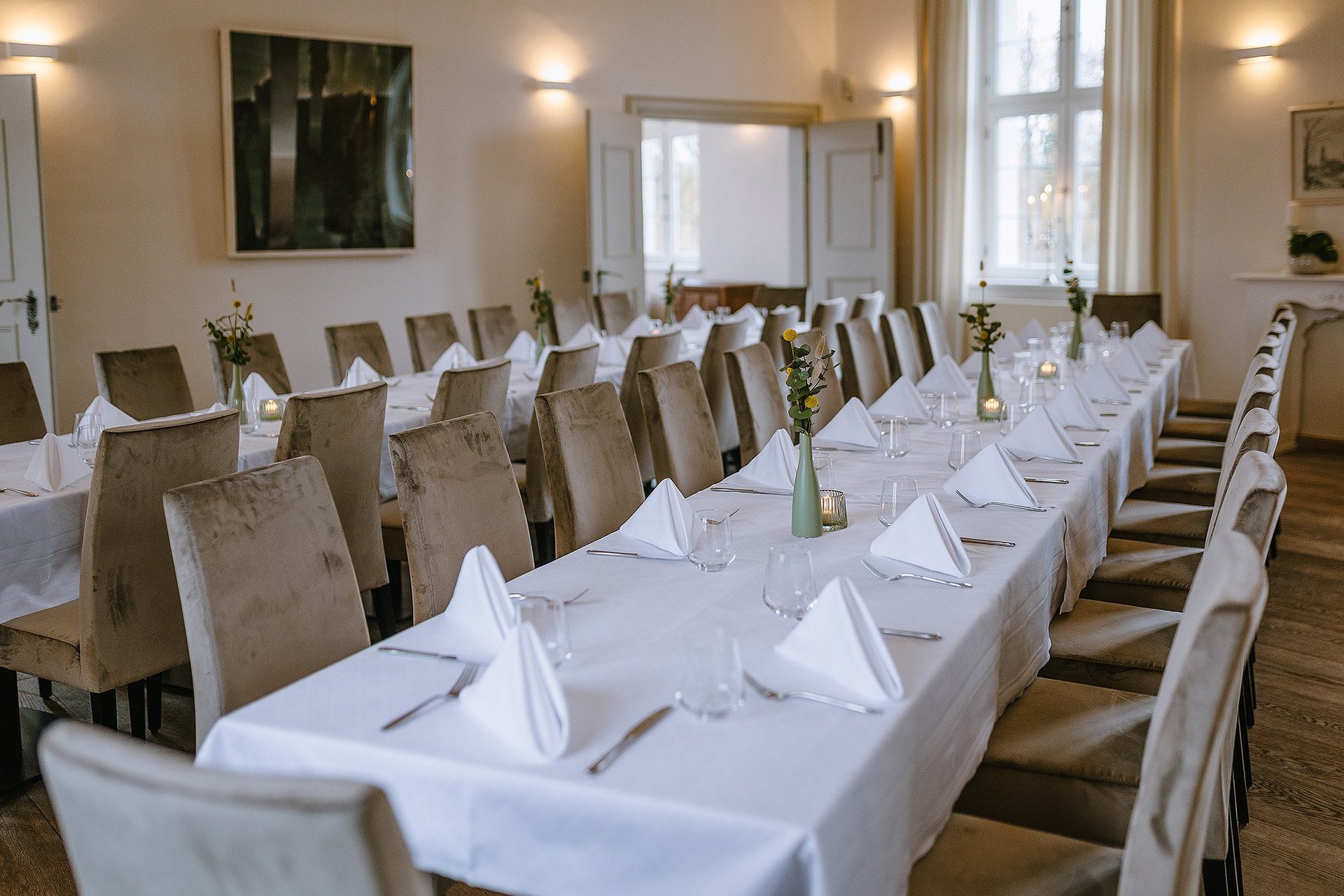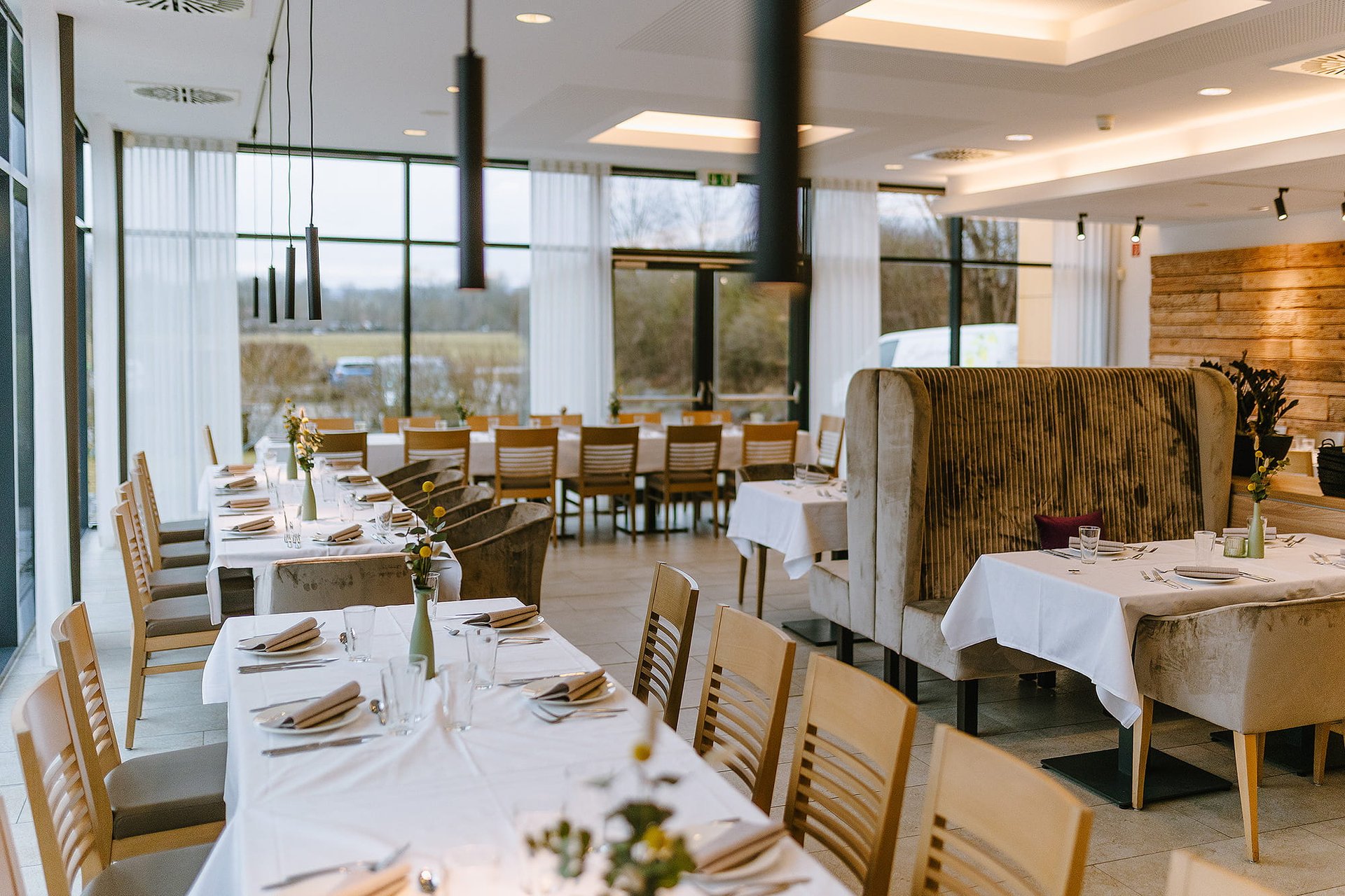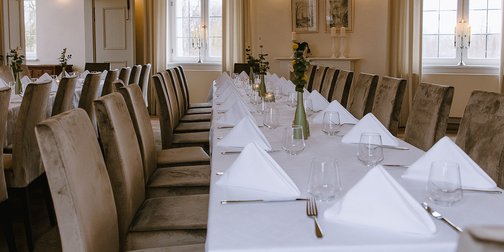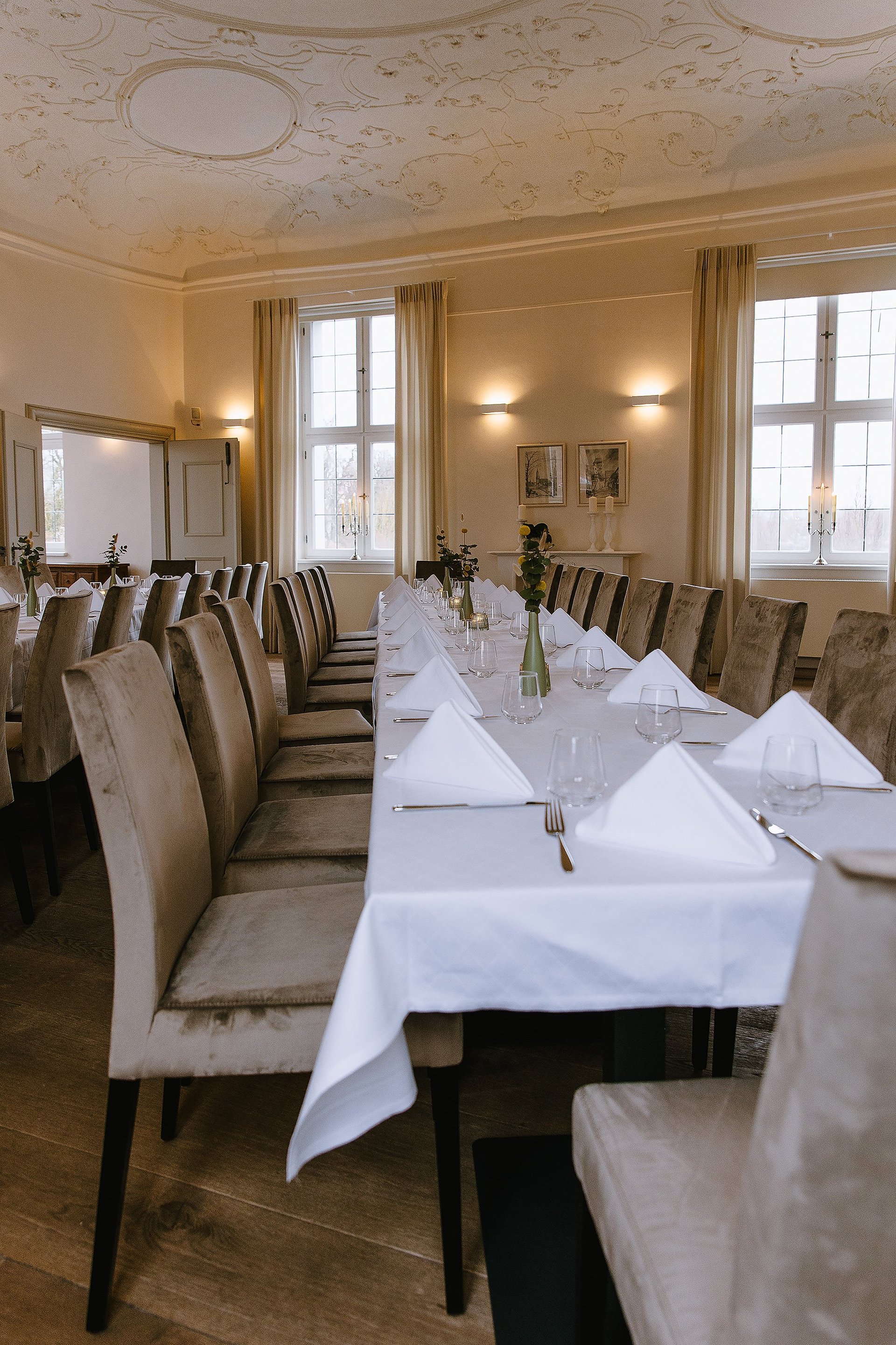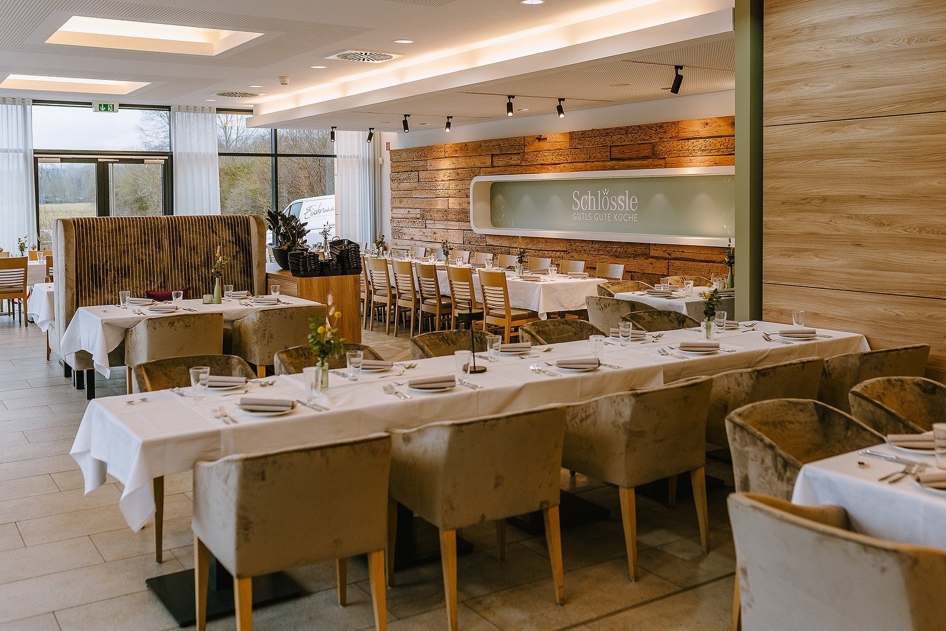 Optisch aufwertend und zugleich stabil und edel: Das sind die bequemen Sitzmöglichkeiten im Gutls Schlössle Nördlingen, die sich ins Interior nahtlos einfügen.