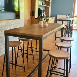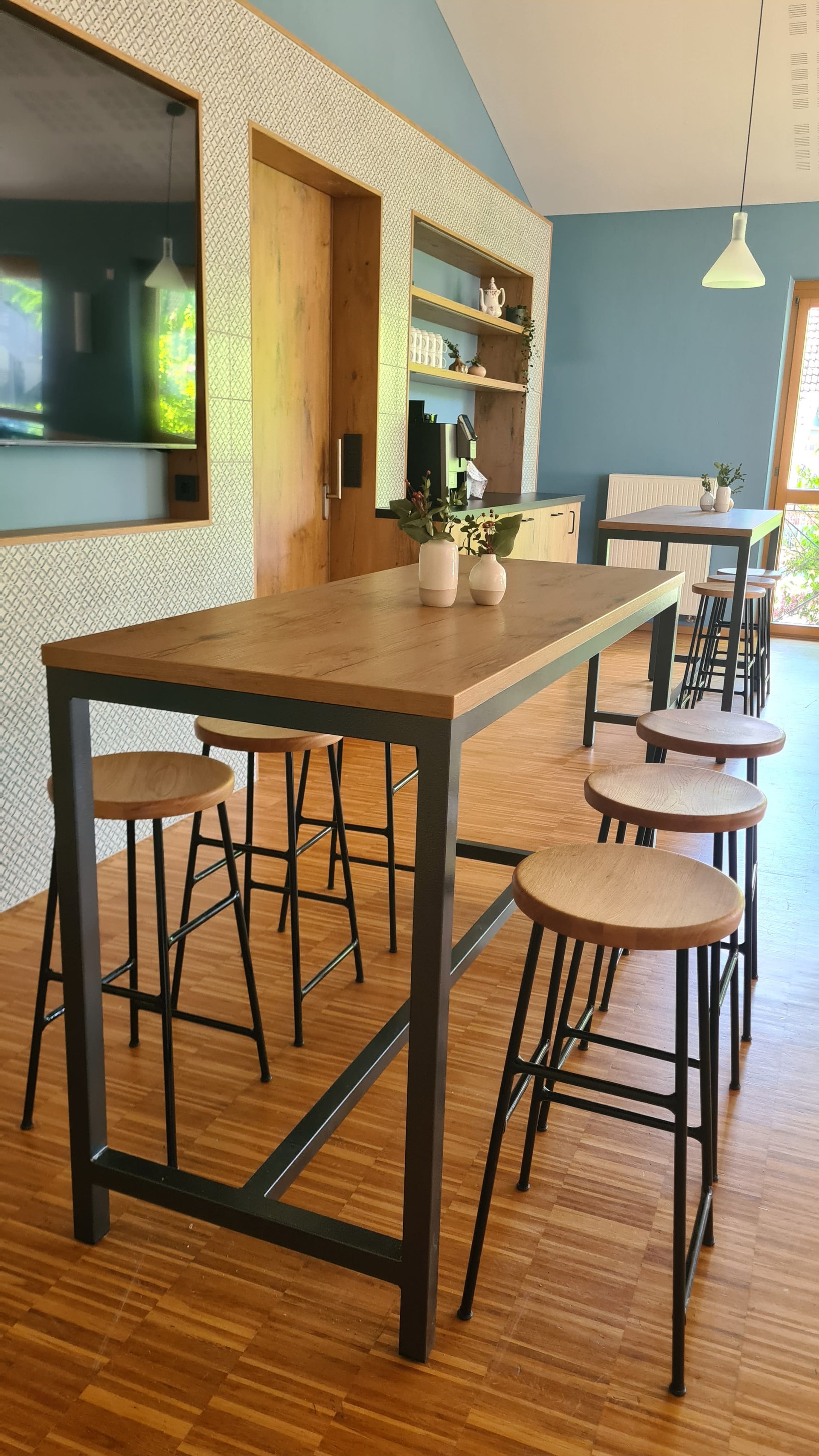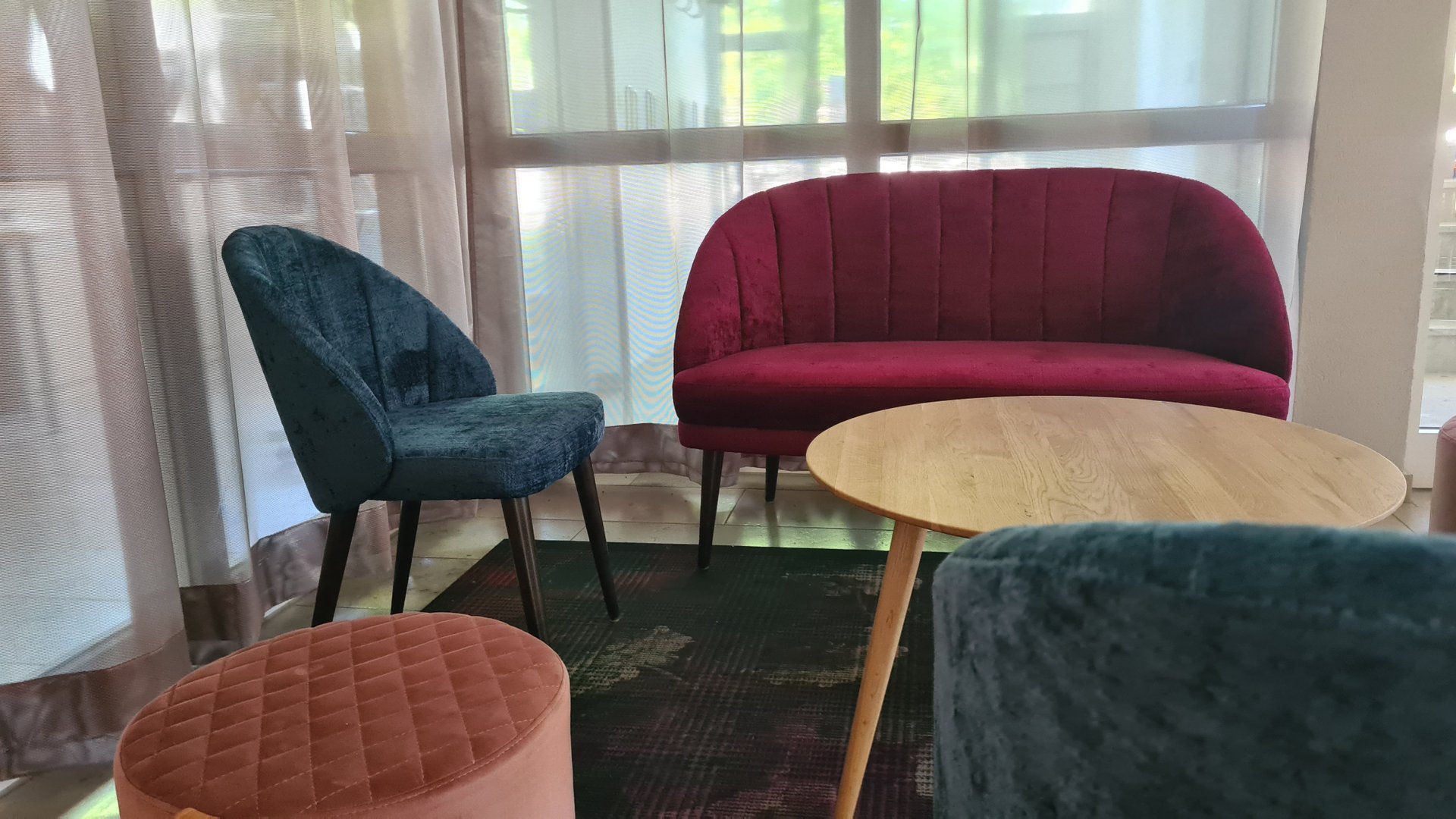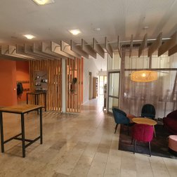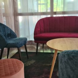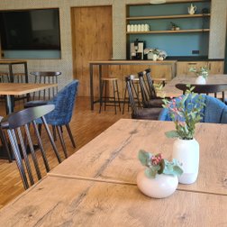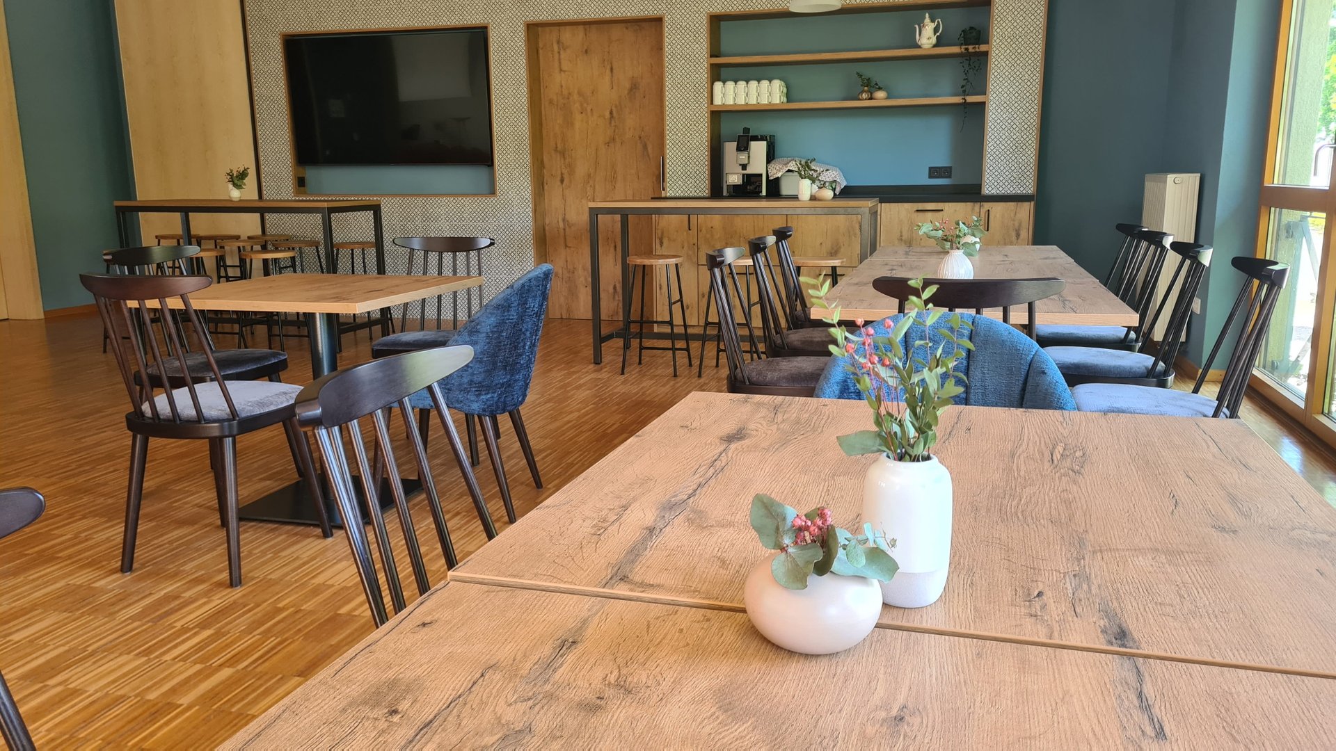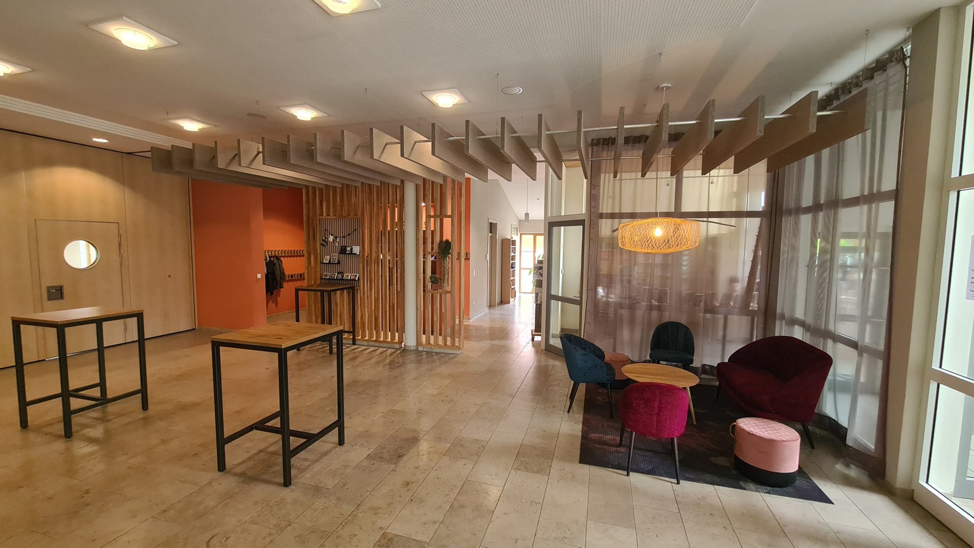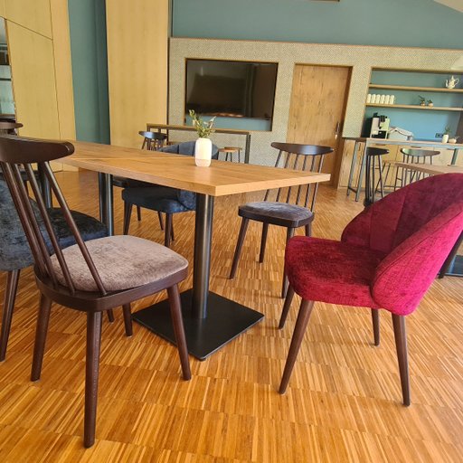 Stühle, Sessel, Bank. Dazu Tische und passende Hochstühle. In den Innenräumen der Liebenzeller Gemeinschaft Wassertrüdingen werden funktionale Anforderungen mit abwechslungsreichem Design zum gewünschtem Komfort kombiniert.