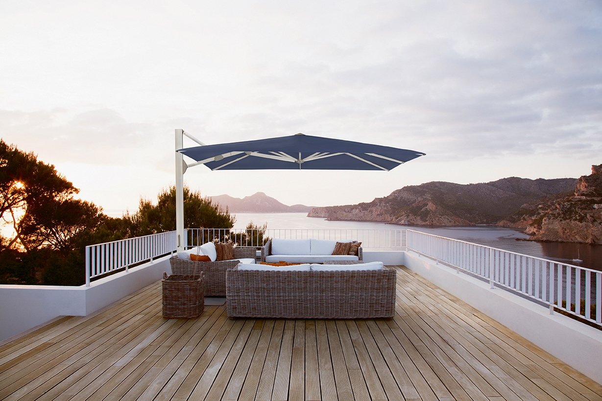 - Optischer Hingucker: Der Ampelschirm sorgt für das gewisse Etwas auf einer Terrasse.