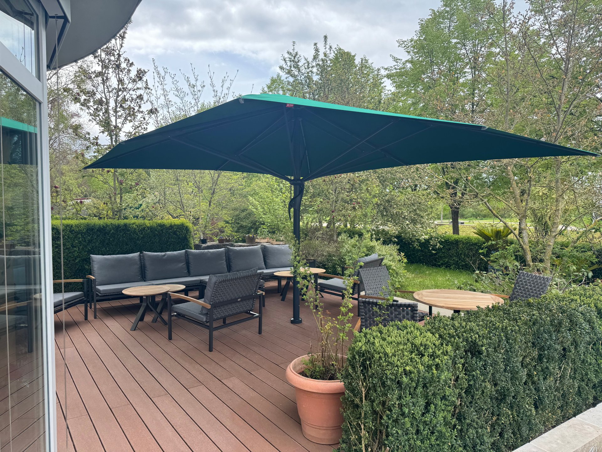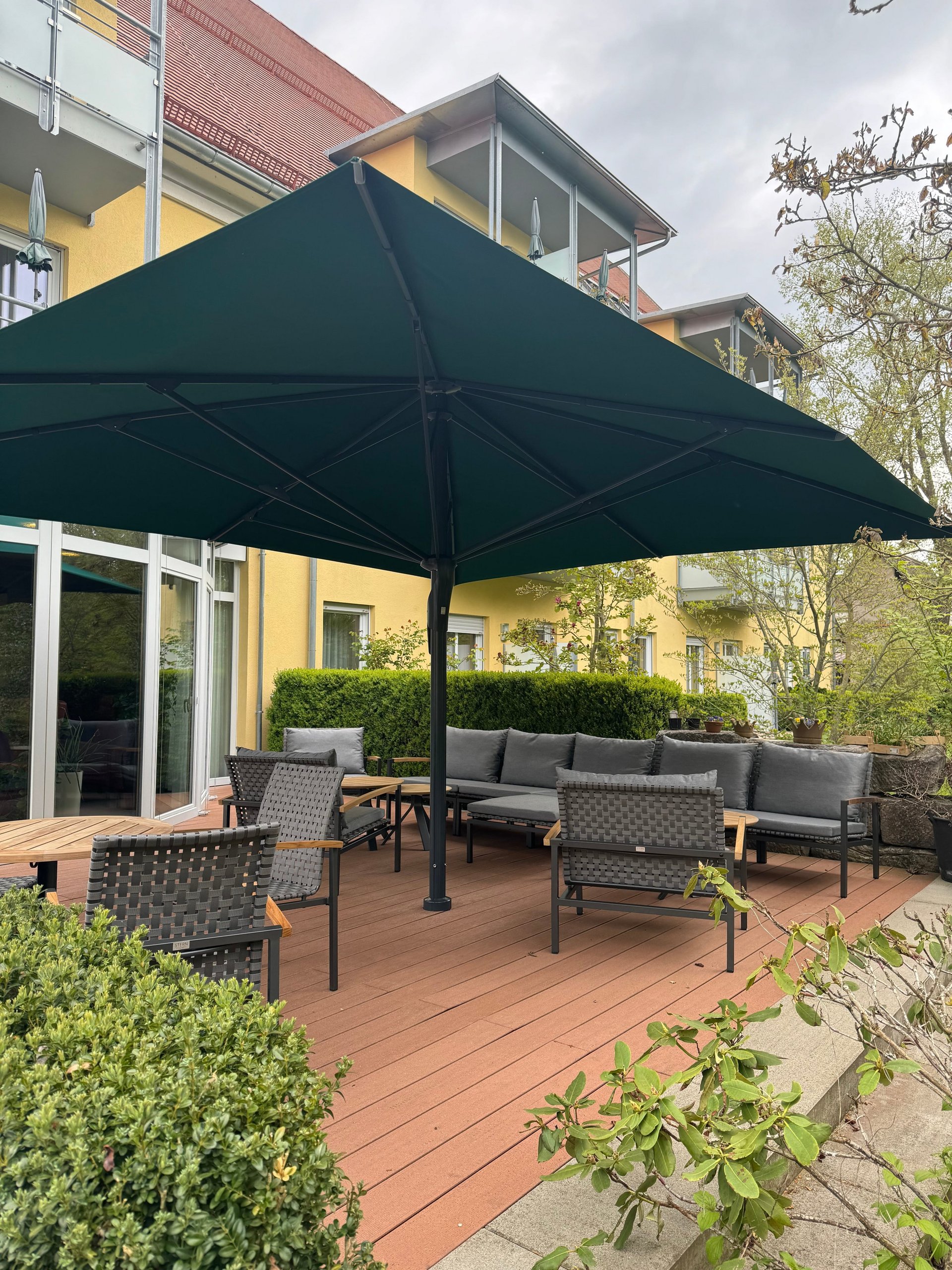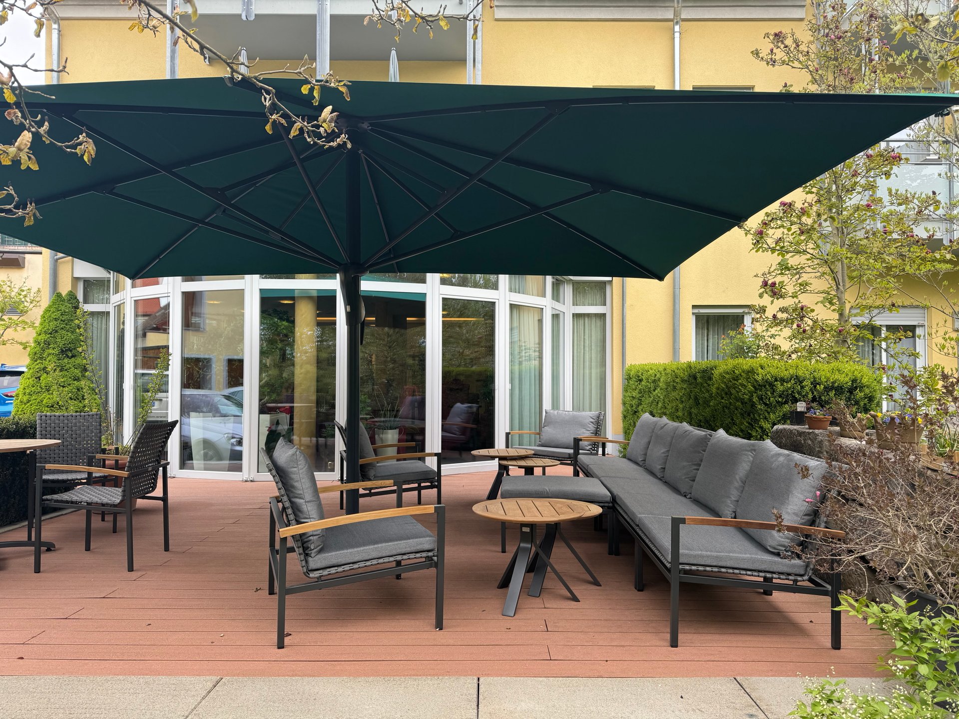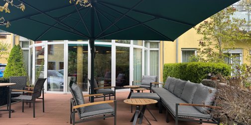 Eine Bank und Stühle mit Polsterung und Armlehne für verschiedene Sitzbedürfnisse, dazu ein Schirm, der Schatten spendet. Das alles farblich abgestimmt. So besticht der Outdoor-Bereich des Adlerbräu Gunzenhausen.