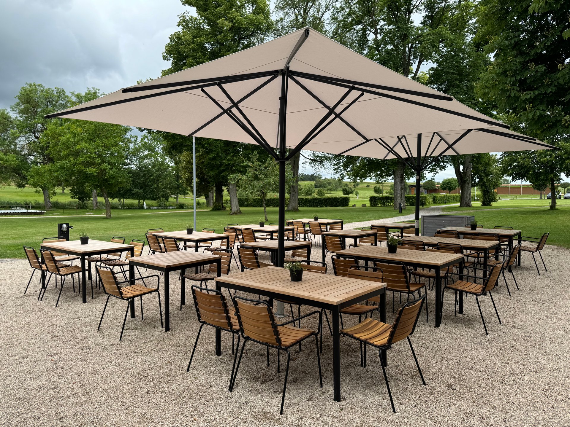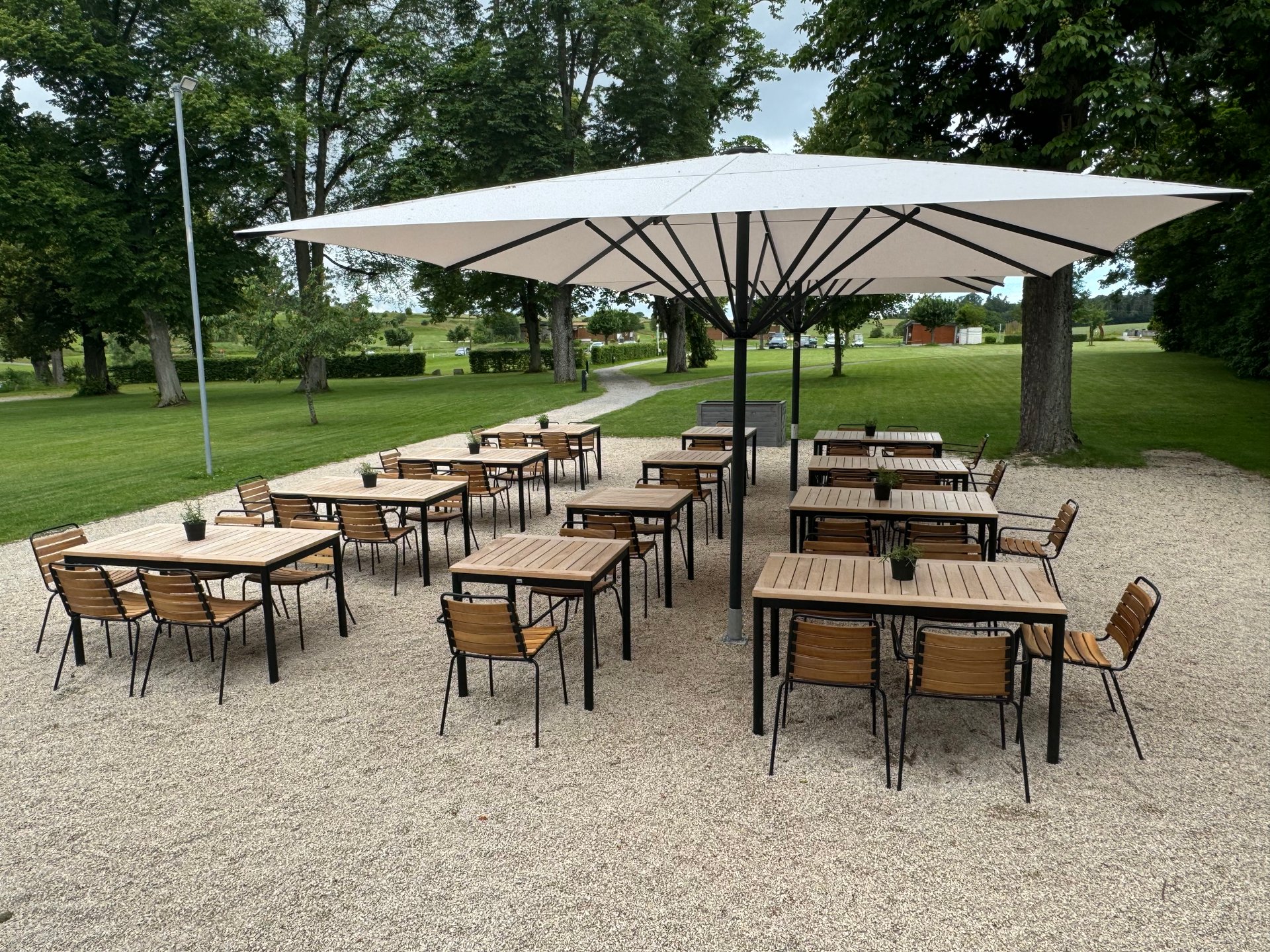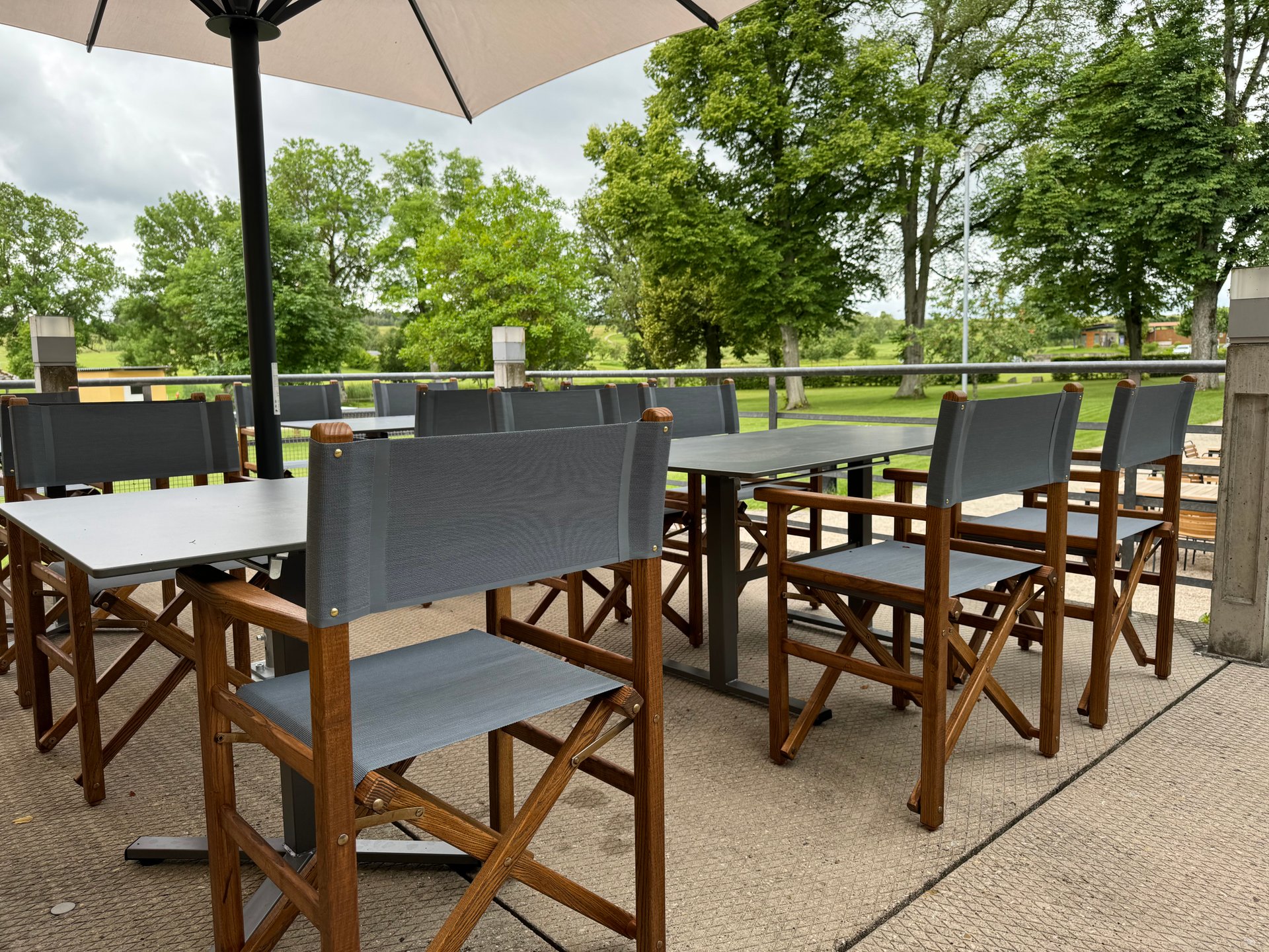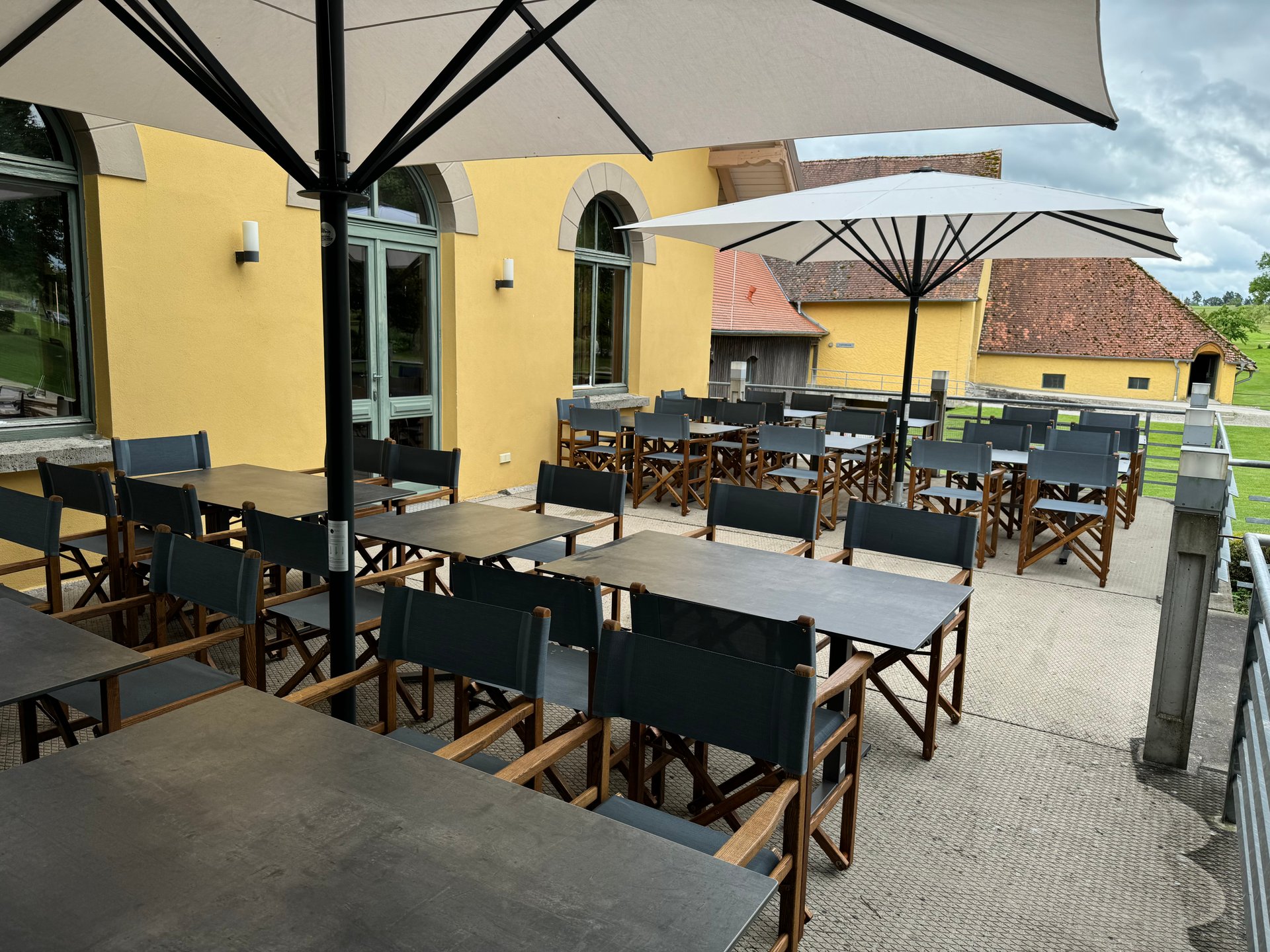 Im Grünen sitzen und den Blick schweifen lassen: im Schatten die Pause nach dem Sport genießen, umgeben von natürlichen Materialien.