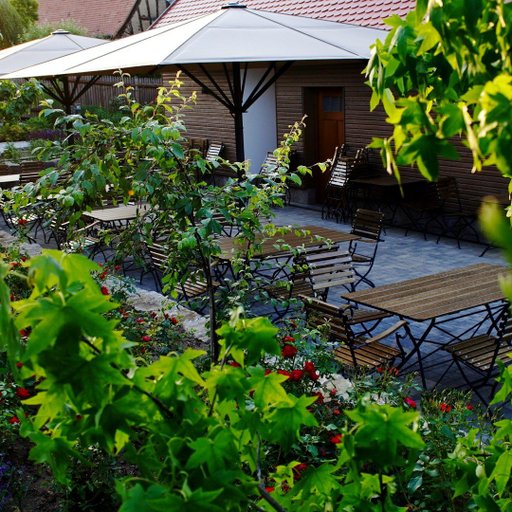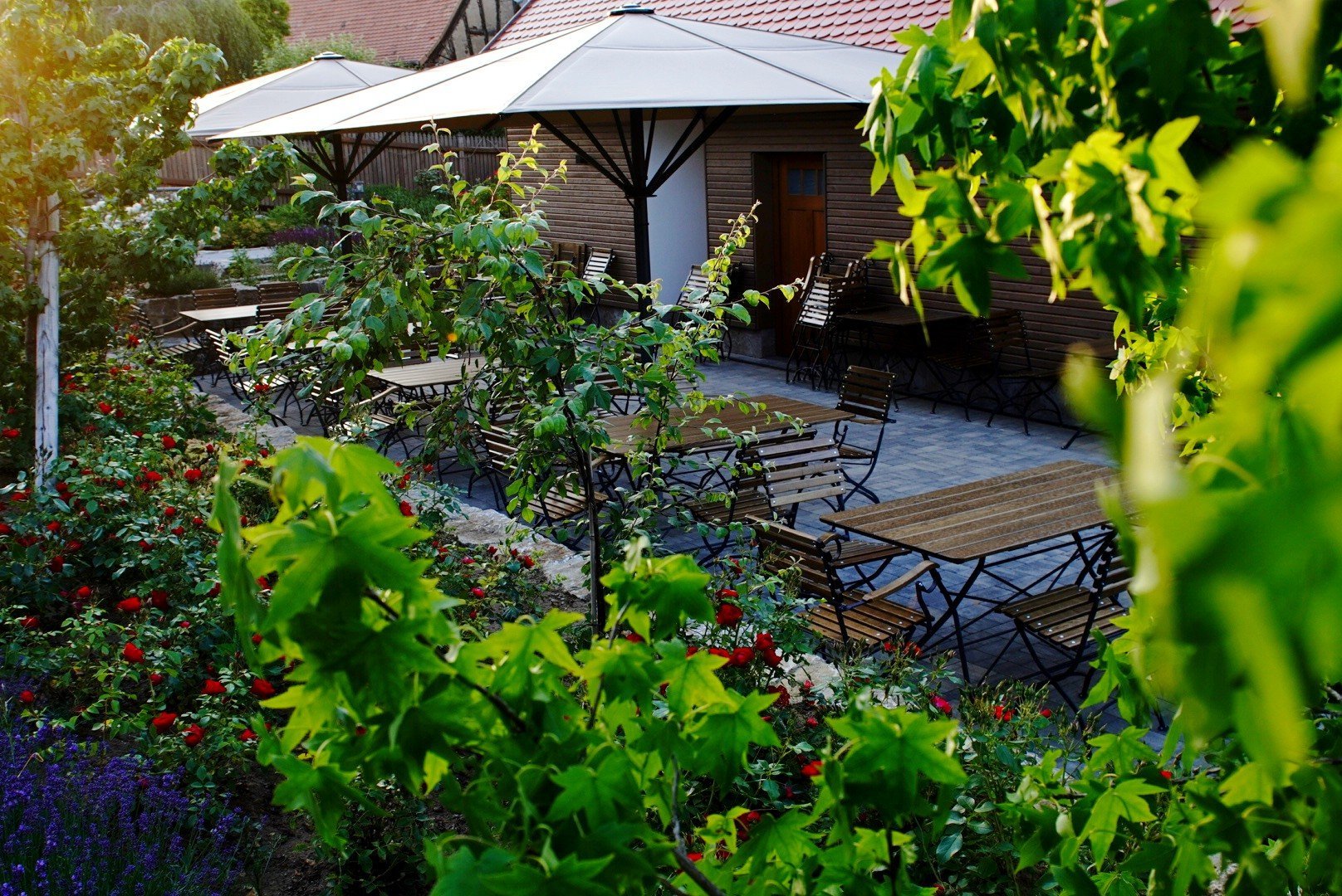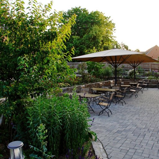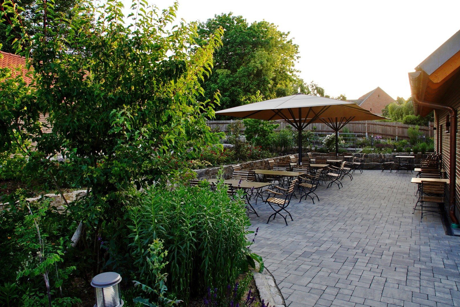 Die witterungsbeständigen und funktionalen Stühle und Tische, dazu Schirme für den Sonnenschutz. Mehr braucht's gar nicht für einen Biergarten mit Flair im Grünen.