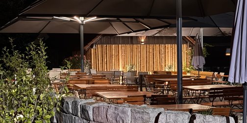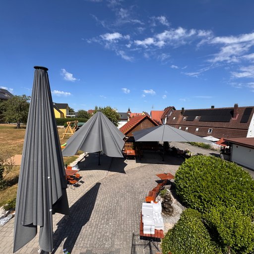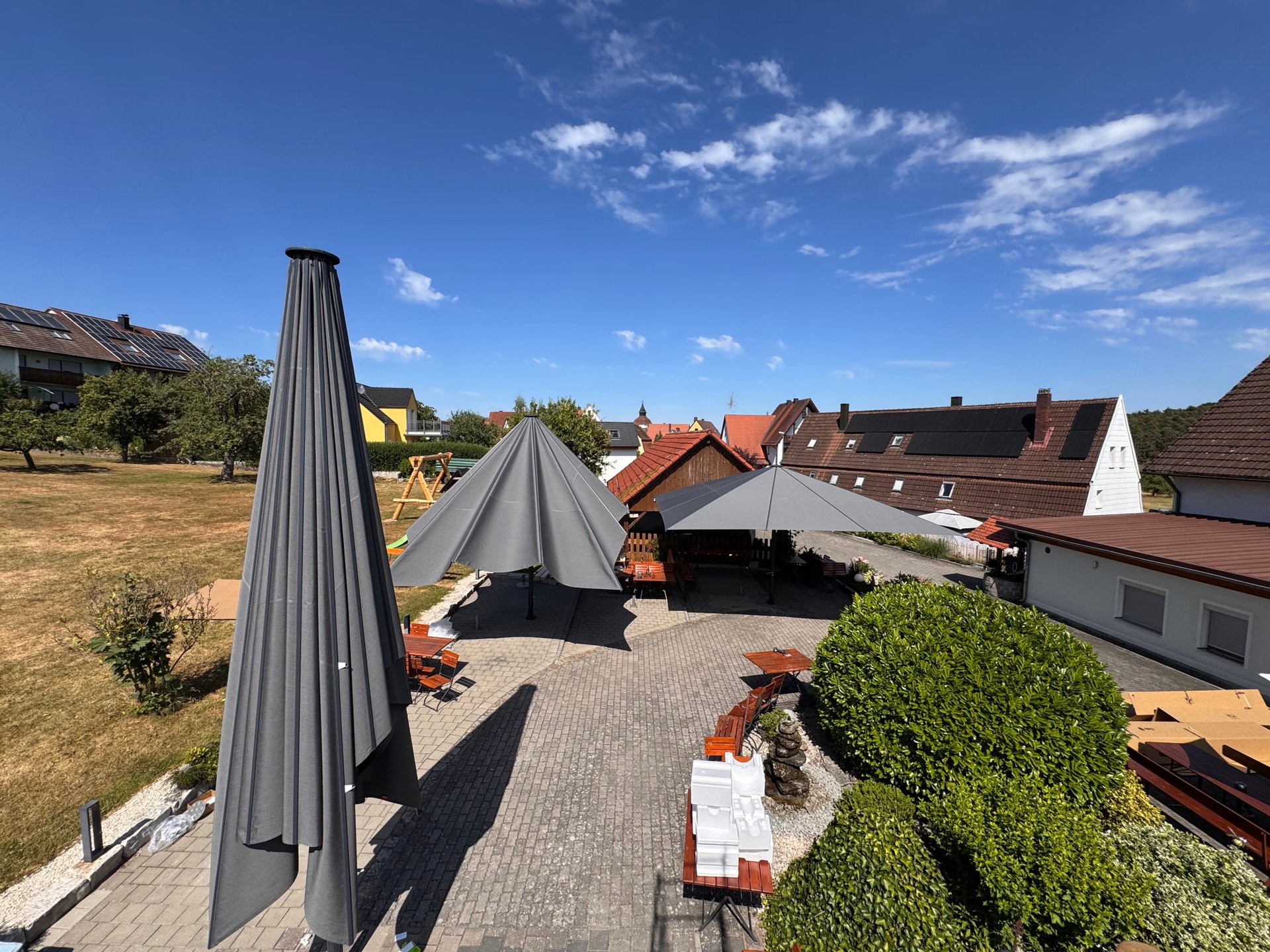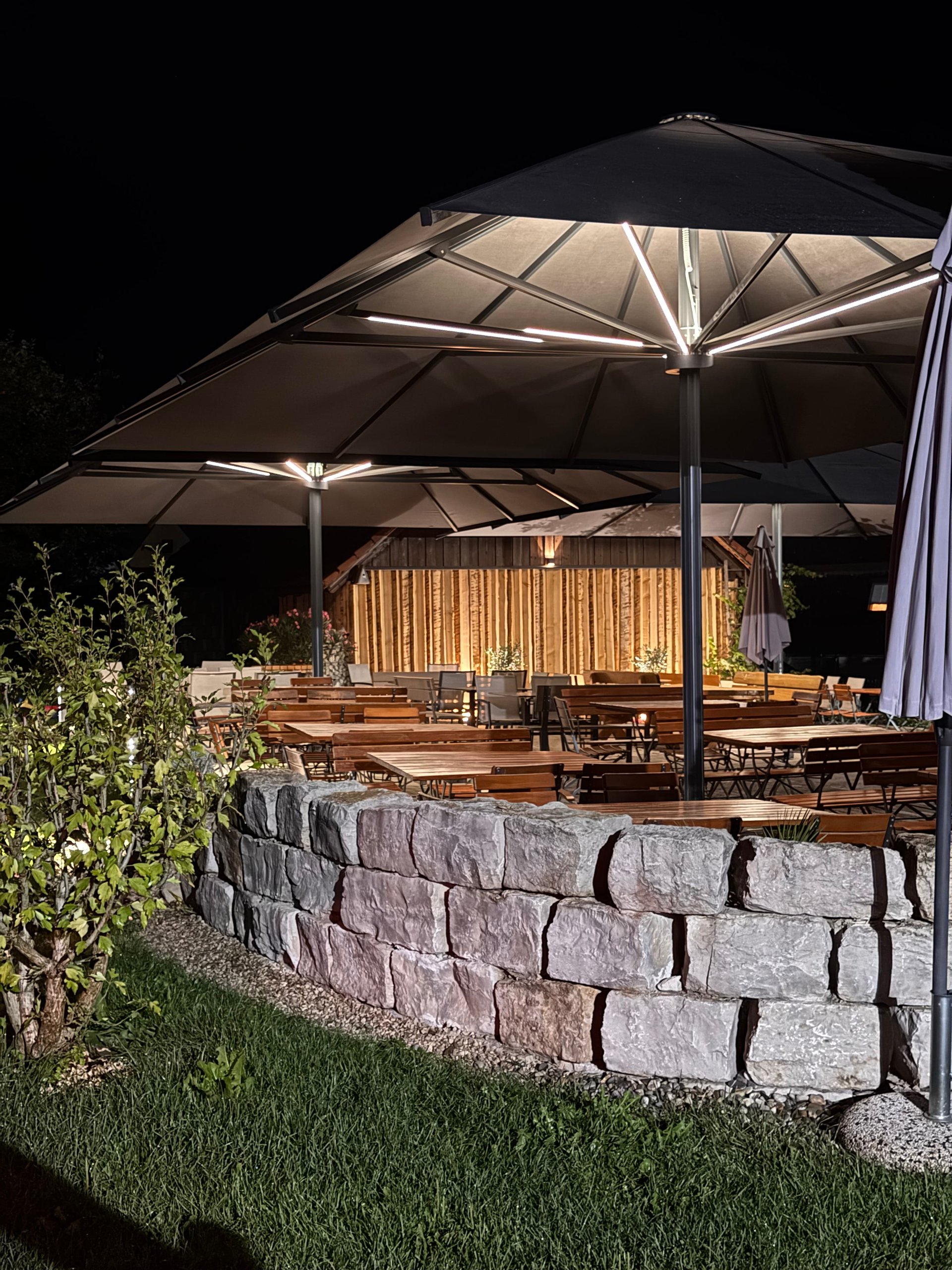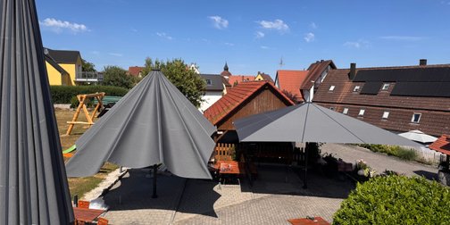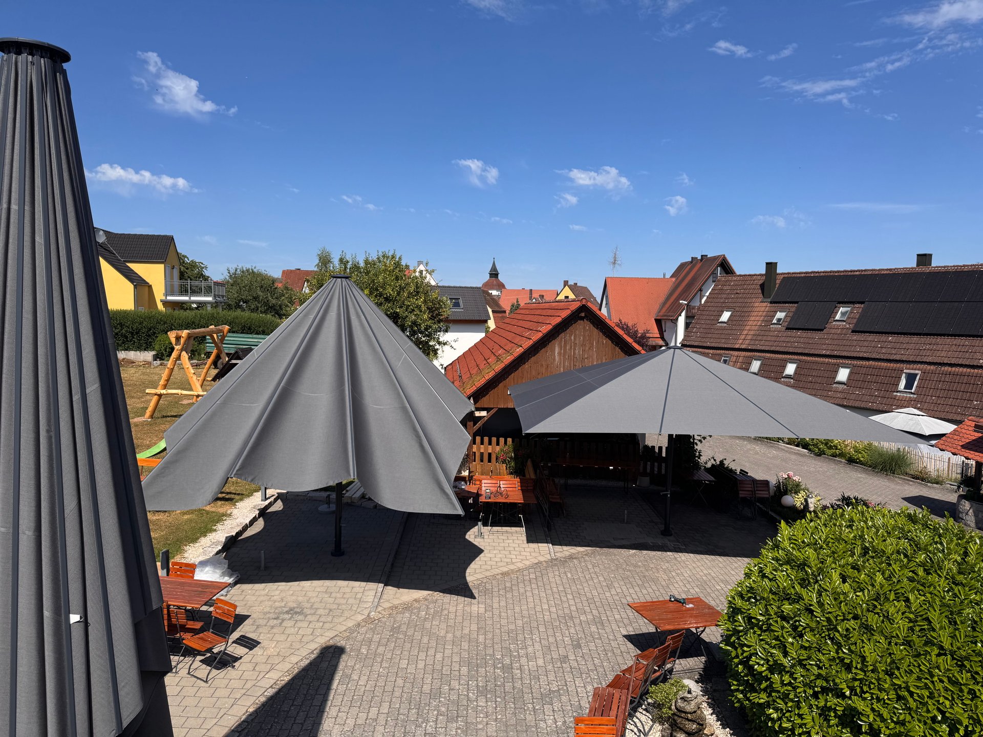Wenn die Sonne mal wieder etwas kräftiger scheint, bieten die Schirme den Gästen des Landgasthauses den gewünschten Schatten, um Speisen und Getränke in angenehmen Ambiente zu genießen.